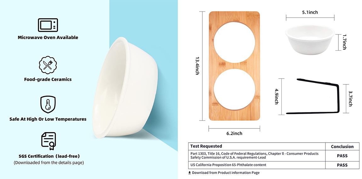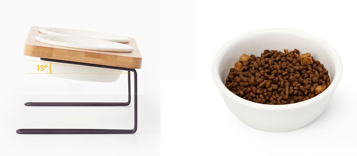 TIGELAS DE CERÂMICA DE GRAU ALIMENTAR - (Certificação SGS, download da página de informações do produto)O material cerâmico é resistente, sem ferrugem e inofensivo para gatos. E o suporte natural de bambu é revestido com verniz, que é impermeável e durável.