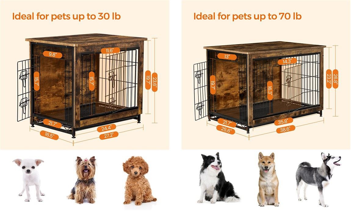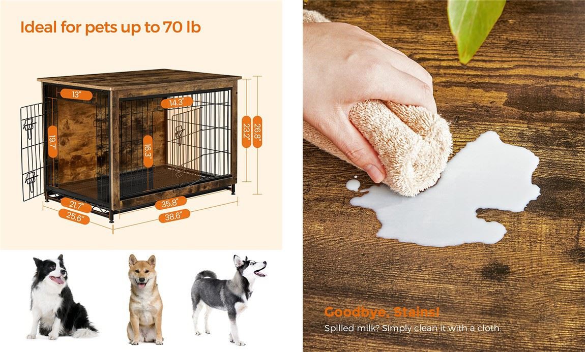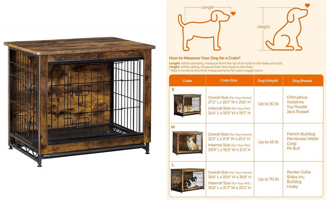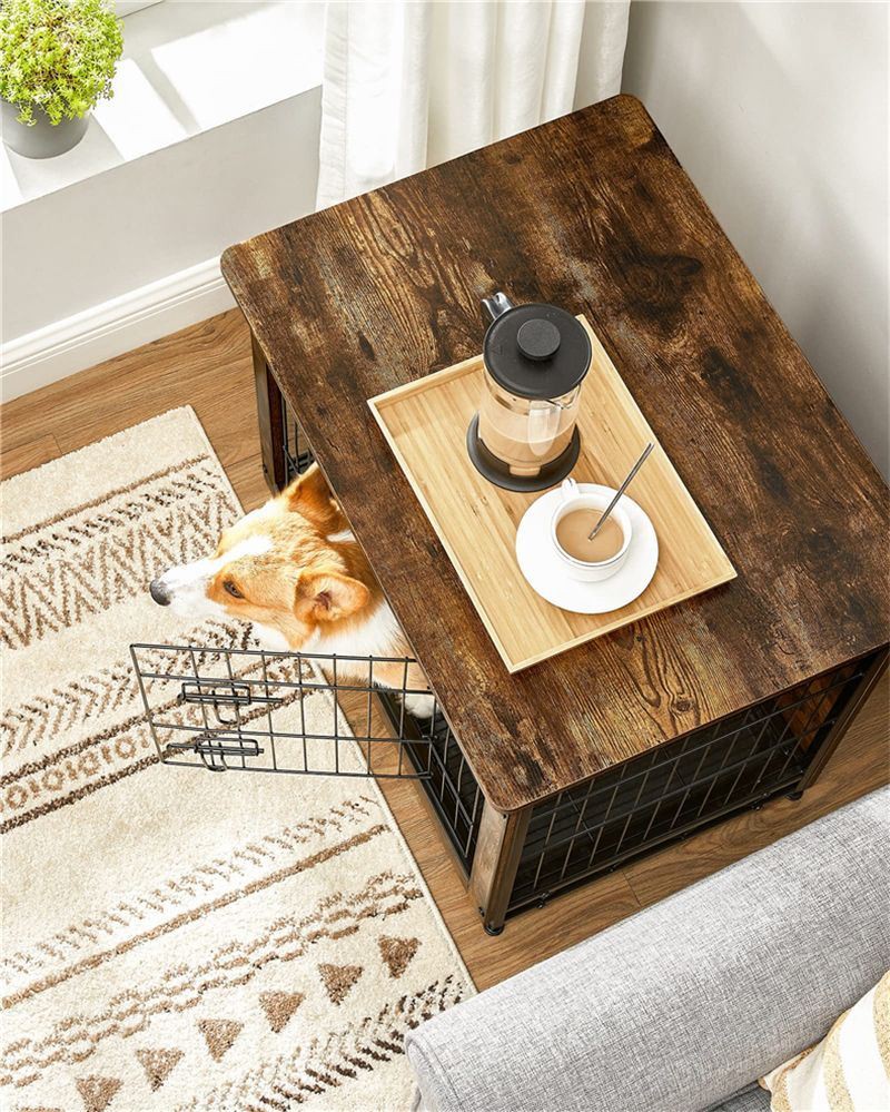 2) Título:Caixote de madeira para cães, mesa de canto para caixotes para animais de estimação, móveis para cães com bandeja removível