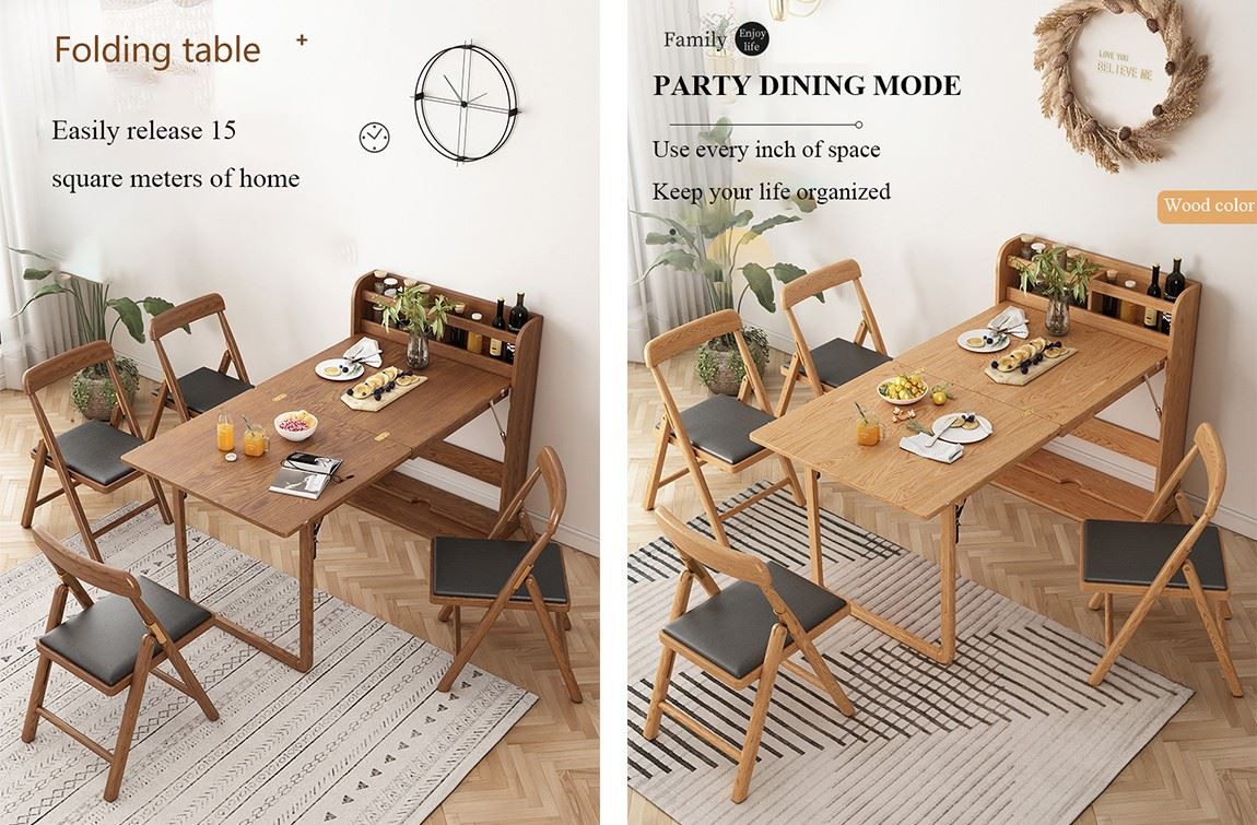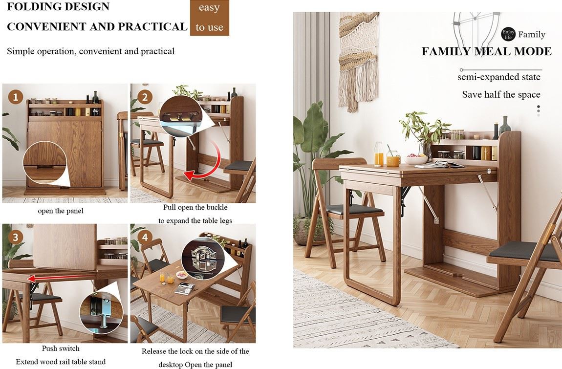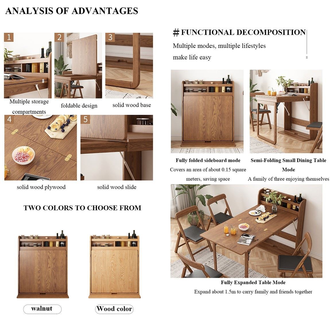 1. Modos múltiplos, múltiplos estilos de vida. Totalmente dobrado, modo aparador, cobre uma área de cerca de 0,15 metros quadrados, economizando espaço. Semi-dobrável, pequeno modo de mesa de jantar, uma família de três pode se divertir. Totalmente desdobrado, modo mesa de jantar, desdobrado cerca de 1,5 metros, carregando o momento feliz da família e amigos.